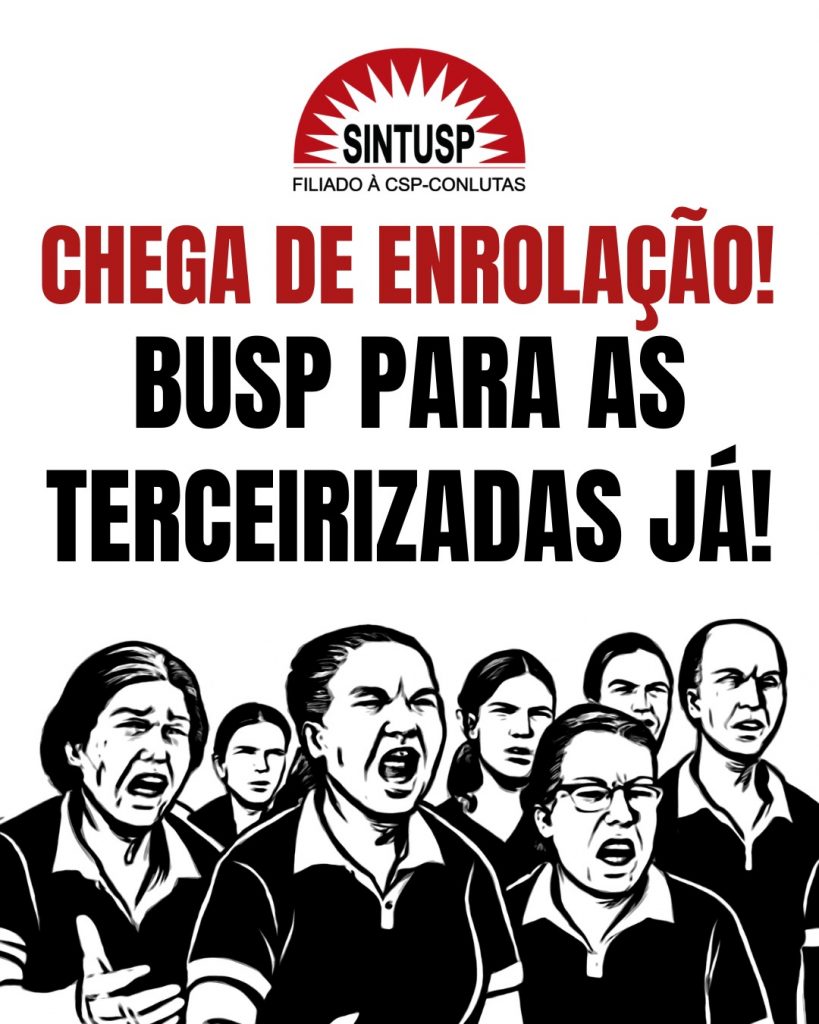 Já enviamos ofícios, emails e pedimos esclarecimentos no Conselho Universitário e até agora a reitoria não se pronuncia sobre a promessa feita pelo reitor. A reitoria precisa se pronunciar e garantir que o BUSP de fato chegue às mãos das trabalhadoras terceirizadas. Exigimos a imediata implementação do BUSP para todas as trabalhadoras terceirizadas, com as mesmas condições dos demais segmentos da universidade. O Sintusp seguirá denunciando o descaso e mobilizando a categoria até que essa dívida histórica seja paga!