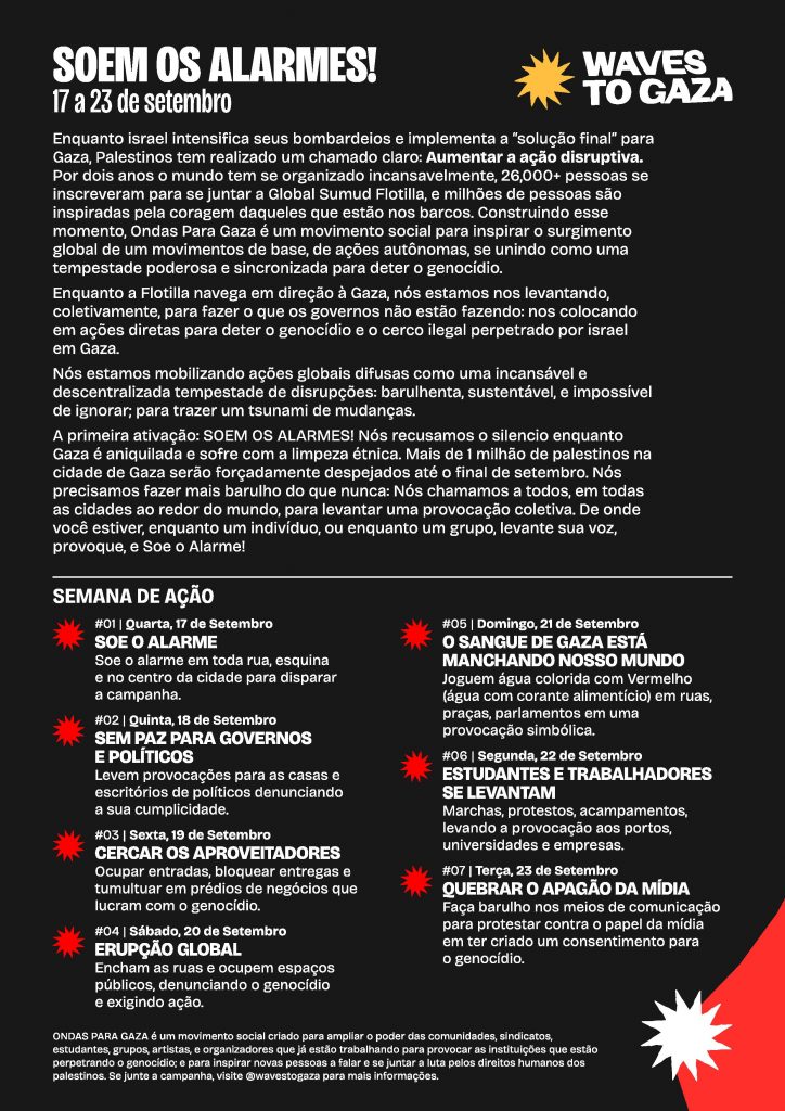PDF AQUI Navegação de Post [DIVULGANDO] ‘Missão Coordenada’: Mais Barcos se Juntam à Flotilha Global Sumud a Caminho de Gaza15 de setembro de 2025 Reunião de organização do Acampamento em Solidariedade ao Povo Palestino e à Global Sumud Flotilla