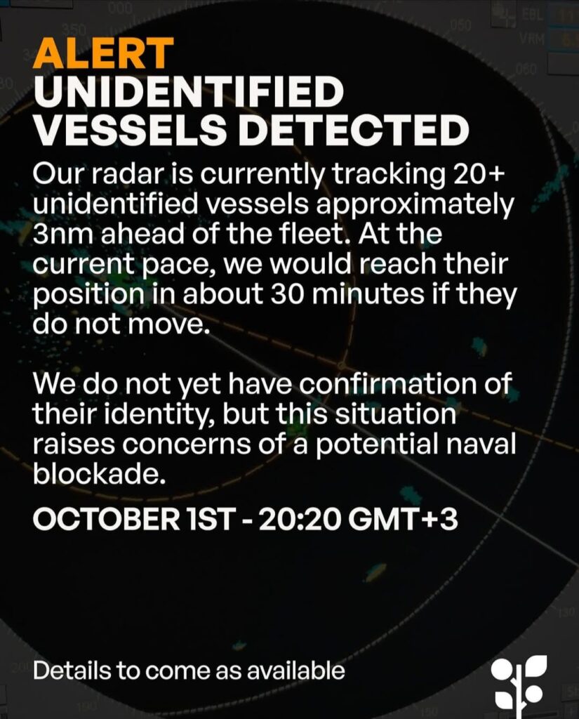 Temos barcos militares a 7 milhas à frente! Agora já são dezenas de navios que devem tentar um bloqueio, mas não pararemos!