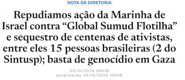 A Diretoria da Adusp manifesta seu repúdio à ação arbitrária do governo de Israel, que no dia 1º de outubro de 2025 interceptou violentamente a Global Sumud Flotilha, impedindo a chegada de ajuda humanitária destinada à população de Gaza. A flotilha, composta por mais de 40 embarcações e cerca de 500 ativistas de dezenas de países, representa um gesto de solidariedade internacional diante do silêncio de muitos governos frente ao genocídio em curso contra o povo palestino.