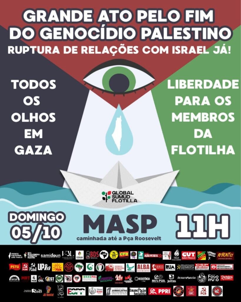É nesse cenário que vemos iniciativas como a Flotilha, que busca quebrar o cerco ilegal de israel a Gaza e abrir um corredor humanitário permanente. Uma missão pacífica composta por civis que arriscam suas vidas, pois cansaram de ver seus governos falharem em agir. Toda proteção e apoio à Flotilha e seus tripulantes! Os trabalhadores na Europa e os estudantes aqui no Brasil também estão mandando o recado: paremos tudo para parar o genocídio!