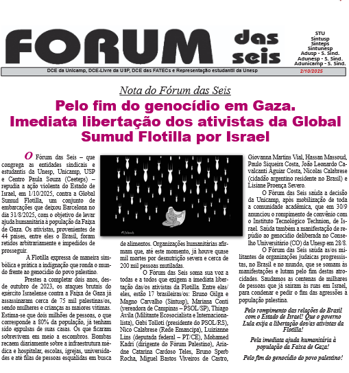 Nota Fórum das Seis: Pelo fim do genocídio em Gaza. Imediata libertação dos ativistas da Global Sumud Flotilla por Israel.