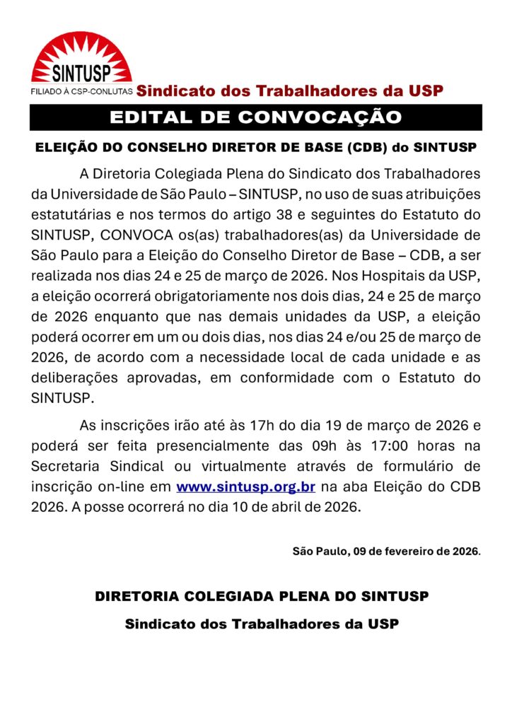 EDITAL DE CONVOCAÇÃO: ELEIÇÃO PARA O CDB do SINTUSP