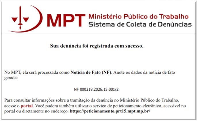 A Notícia de Fato é pública e pode ser acompanhada por qualquer trabalhador, utilizando o número do procedimento: Notícia de Fato nº 000318.2026.15.001/2