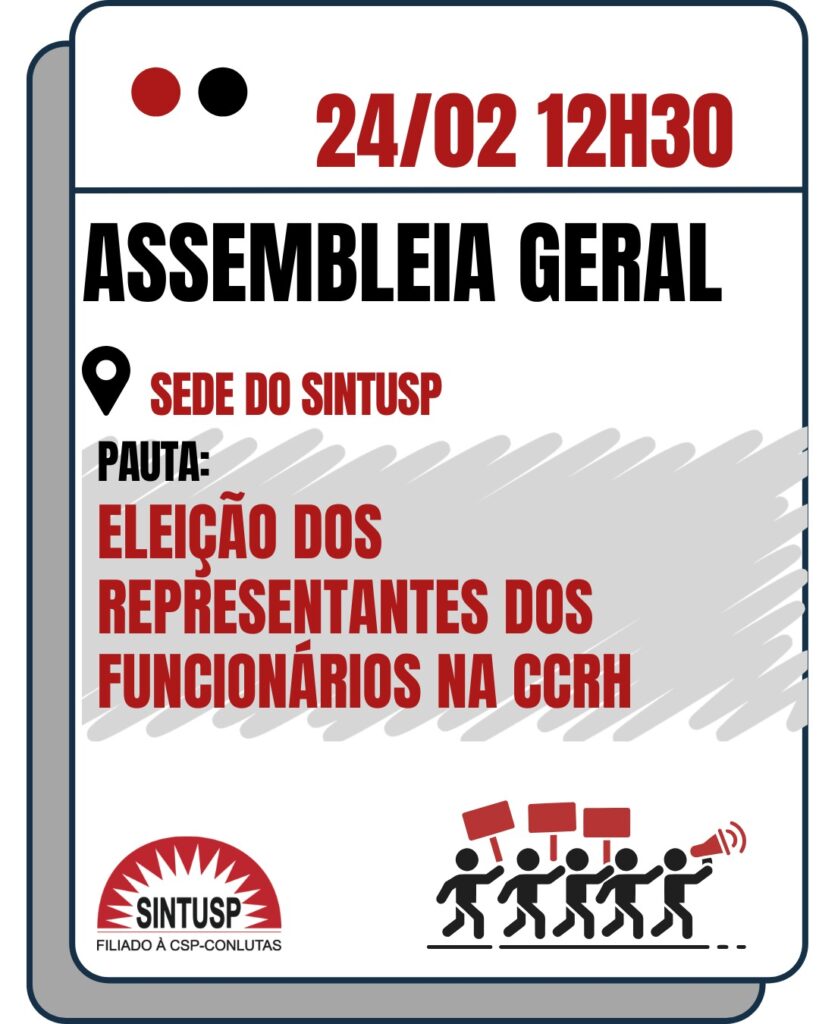 Assembleia geral 3ªfeira (24/2), às 12h30 no SintuspPauta: Eleição de representantes dos funcionários para a CCRH Navegação de Post Reunião da Secretaria de Mulheres do Sintusp