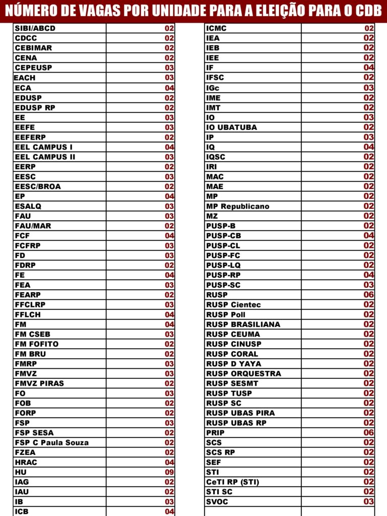 Conforme o Estatuto do SINTUSP, no seu artigo 39º. Os CDB – Conselheiros Diretores de Base serão eleitos pelos associados lotados nas unidades e órgãos da USP, segundo os critérios:-
