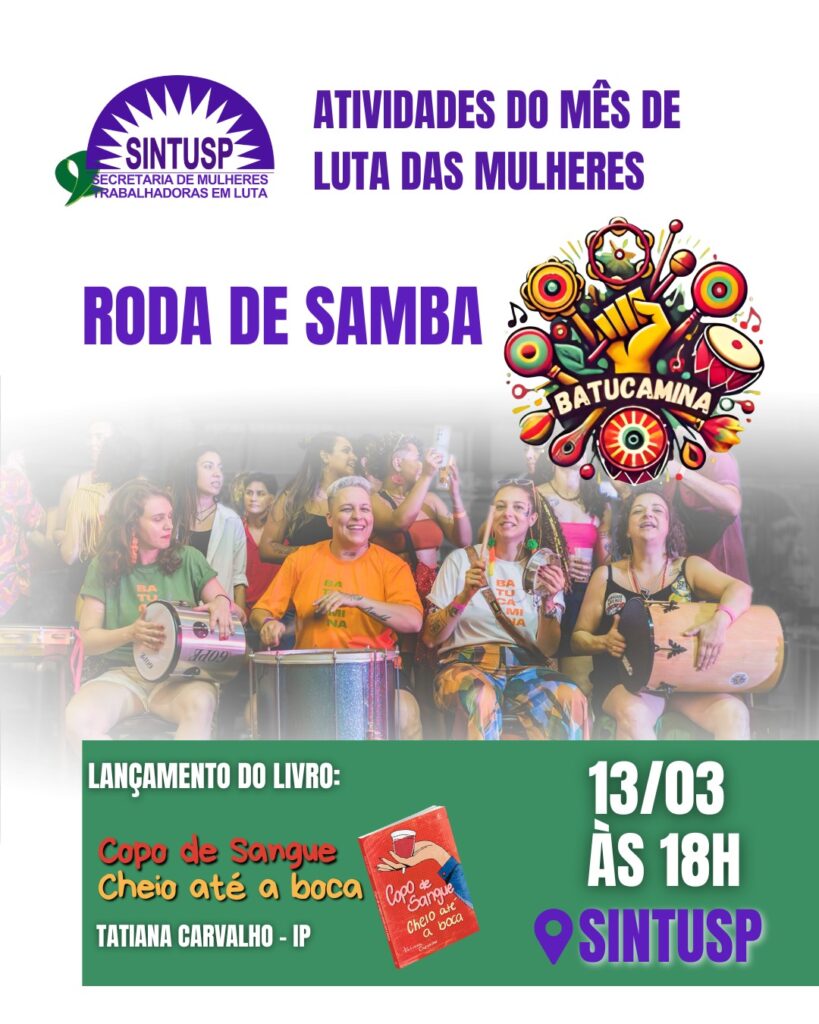 13/03 Lançamento do Livro Copo de Sangue cheio até a boca, da nossa companheira Tatiana Carvalho, que trabalha no Instituto de Psicologia da USP às 18h. Em seguida Roda de Samba com o BatucaMina, grupo de samba formado só por mulheres. Vai ter venda de churrasquinho e bebidas
